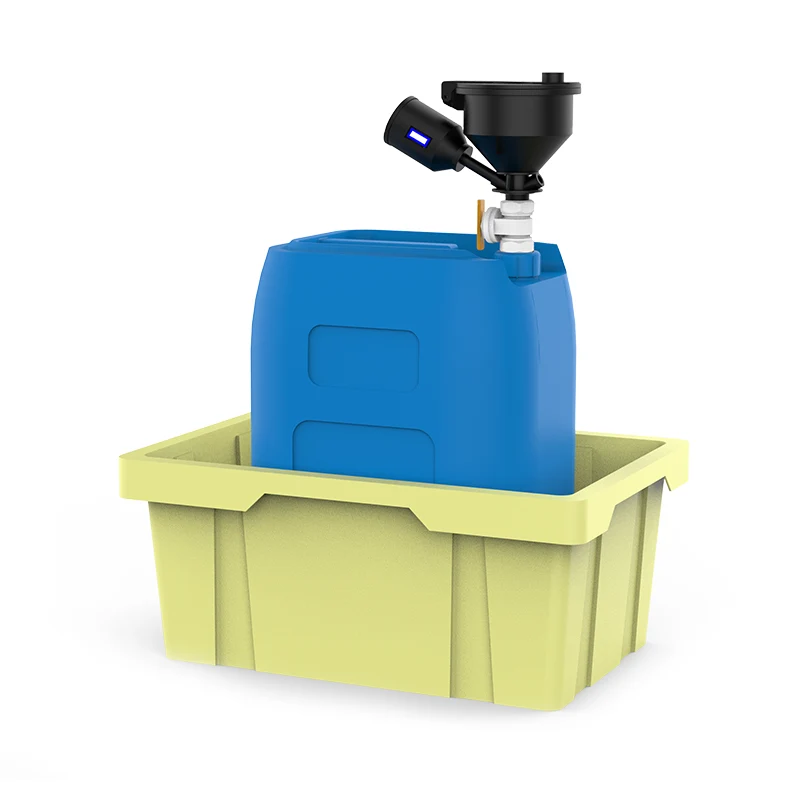 Produktet er utstyrt med en standard anti-lekkasje sekundær beholder lekkasjebrett, og volumet er større enn 10 % av volumet til oppsamlingsfatet. Materialet er laget av PP.
