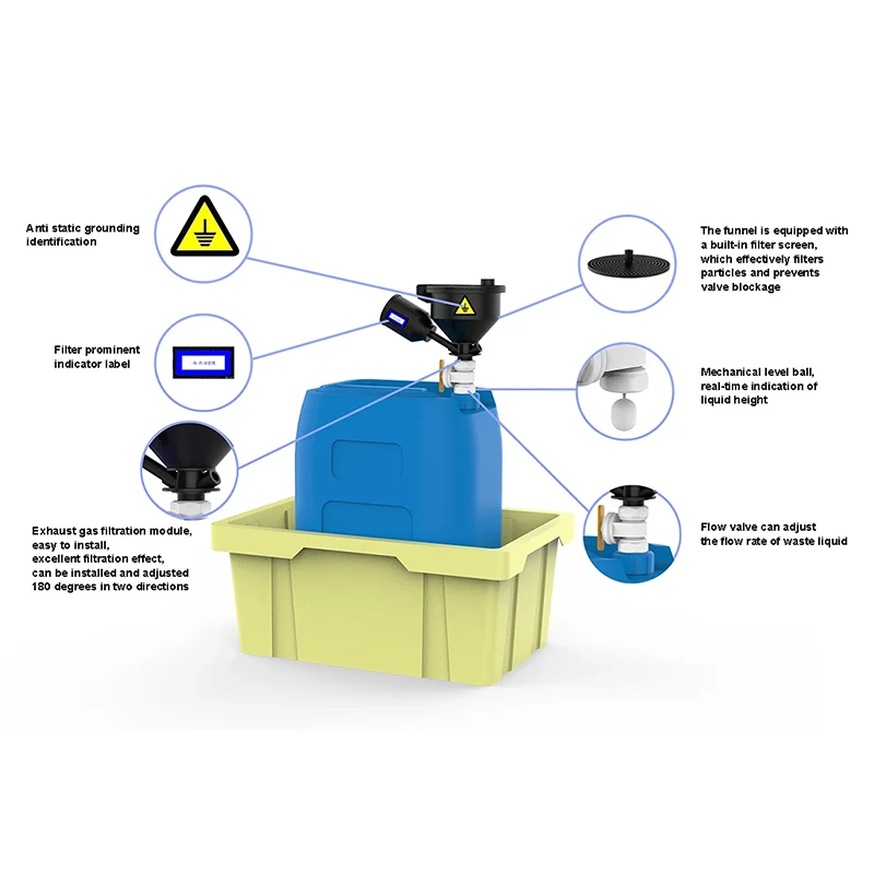 Innsamlingsanordningen for avfallsvæske har bemerkelsesverdige egenskaper. Oppsamlingsbeholderen er laget av importerte antistatiske PP-råmaterialer, som ikke bare sikrer stabiliteten til materialet, men også effektivt utøver funksjonen til det antistatiske middelet, kontrollerer den statiske elektrisiteten til avfallsvæsketrakten i området 10^5 til 10^9, noe som reduserer risikoen for katastrofer forårsaket av statisk elektrisitet. Trakten har en sofistikert design. Det lekkasjesikre toppdekselet er sammenkoblet med et tetningsdeksel og en sprutsikker filtertrakt, og en ventil kan installeres etter behov for å sikre sikkerheten ved oppbevaring av avfallsvæske. Toppdekselet av motvektstypen justerer automatisk avgassutslippet i henhold til de interne trykkforholdene ved åpning ved 100 Pa og lukking ved 50 Pa, og unngår eksplosjon og spontan forbrenning. Eksosfilteret er koblet i en spiral, som er praktisk for utskifting og forhindrer fordampning av kjemiske komponenter. Det er 5 forskjellige typer tilgjengelig for nøyaktig tilpasning til ulike eksosbehandlinger.